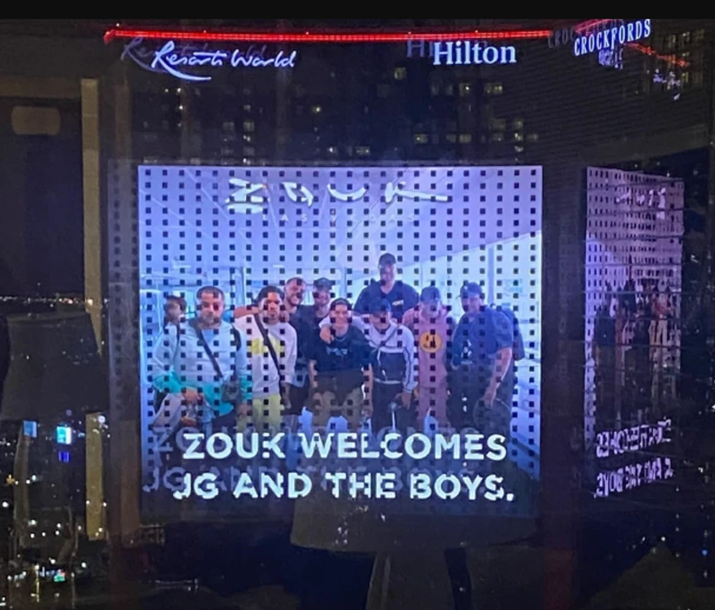 Затем на одном из зданий появилось огромное изображение Грилиша и его друзей. Так англичан поприветствовал ночной клуб Zouk.