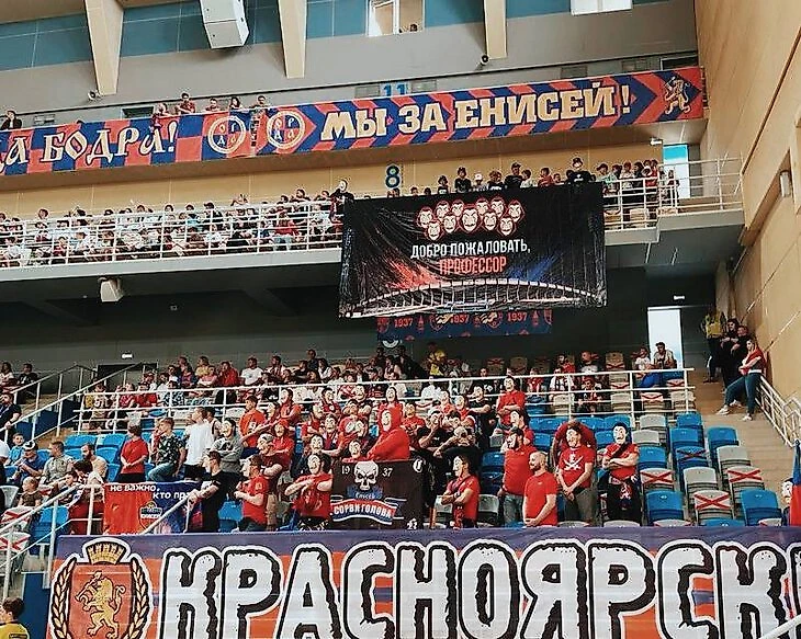 Манеж не помешал красноярским фанатам устроить яркий перформанс: показали красивый баннер в честь нового тренера Артема Горлова. «Добро пожаловать, профессор» – отсылка к популярному сериалу «Бумажный дом».
