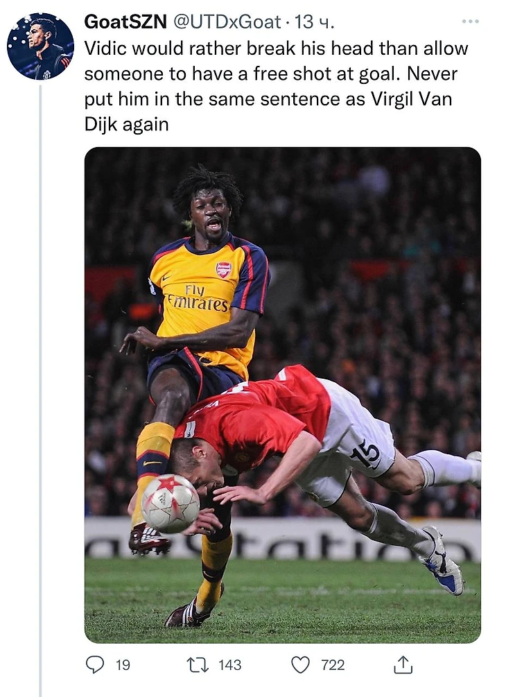Один из пользователей отметил, что Неманья Видич, с которым часто сравнивают Ван Дейка, скорее разбил бы себе голову, чем позволил нанести удар в такой ситуации.
