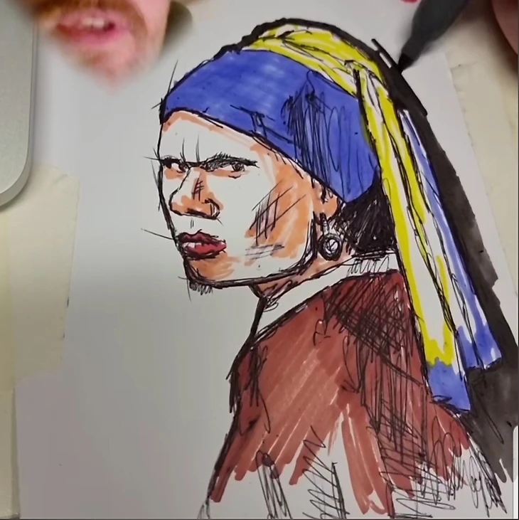«День четвертый, когда я рисую Эрлинга Холанда каждый день, пока не заскучаю». На этот раз норвежец с рыжими косичками и золотыми зубами.