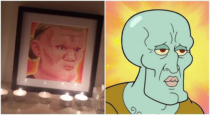 «10-й день рисования Эрлинга Холанда каждый день, пока я не сойду с ума. Мне предложили нарисовать Холанда в образе красивого Сквидварда. Мне так понравился результат, что я сделал алтарь с ним в туалете».