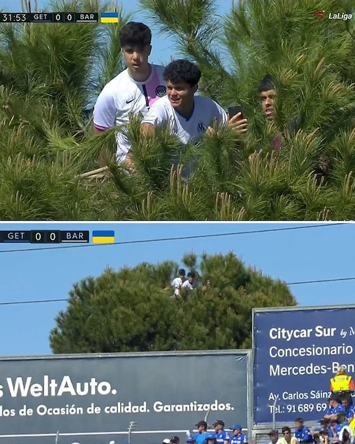 Начнем со смекалистых болельщиков из Испании. В пригороде Мадрида парни в джерси «ПСЖ» и «Марселя» наблюдали за игрой «Хетафе» и «Барсы» с дерева, расположенного за стадионом «Колисеум Альфонсо Перес». Жаль, за кадром осталось то, как молодые люди попали на хвойное.