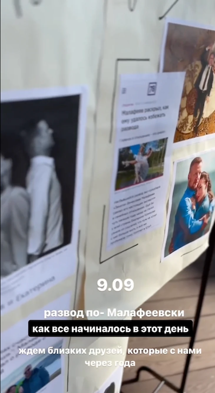 Малафеевы организовали стенд, посвященный разводу – там собраны их совместные фотографии, а еще вырезки из статей газет и журналов про пару.