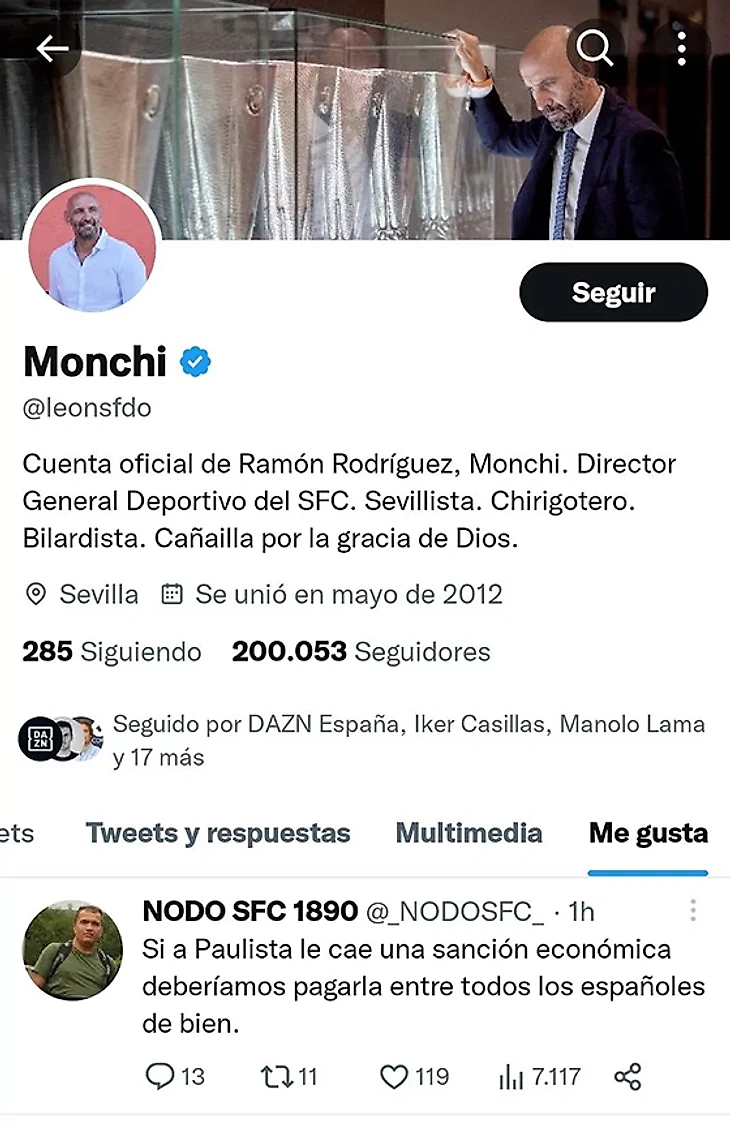 Еще одна громкая история из Испании: в феврале 2023-го спортивный директор «Севильи» Рамон Мончи лайкнул твит, где поддержали защитника «Валенсии» Габриэля Паулисты после жесткого фола на Винисиусе в матче «Реала». «Если Паулиста получит штраф, все испанцы должны скинуться», – твит, которому Мончи поставил Me gusta.
