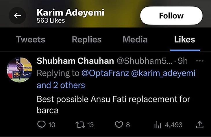 Не всегда лайки ведут к скандалам. Иногда игроки пытаются продать себя. Или просто показывают, как мечтают о переходе: например, Карим Адейеми – о «Барсе». Это твит фаната из 2023-го, по его мнению вингер «Дортмунда» идеально заменит Ансу Фати.