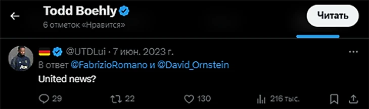 Первый лайк в твиттере владелец «Челси» Тодд Боули поставил под переходом Михаила Мудрика и Леандро Троссарде как якобы утешительном призе «Арсенала». Вскоре снял отметку.