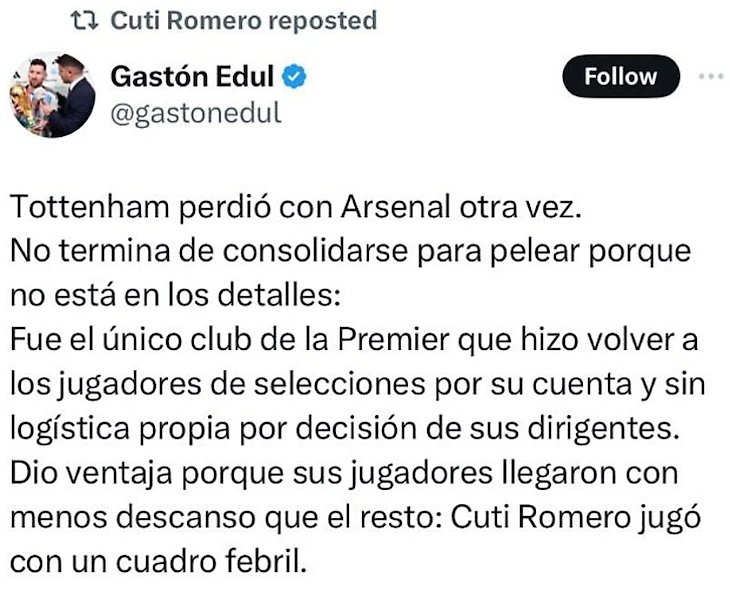 Аргентинский журналист Гастон Эдул обвинил «Тоттенхэм» в том, что клуб сам дал преимущество «Арсеналу» в дерби: