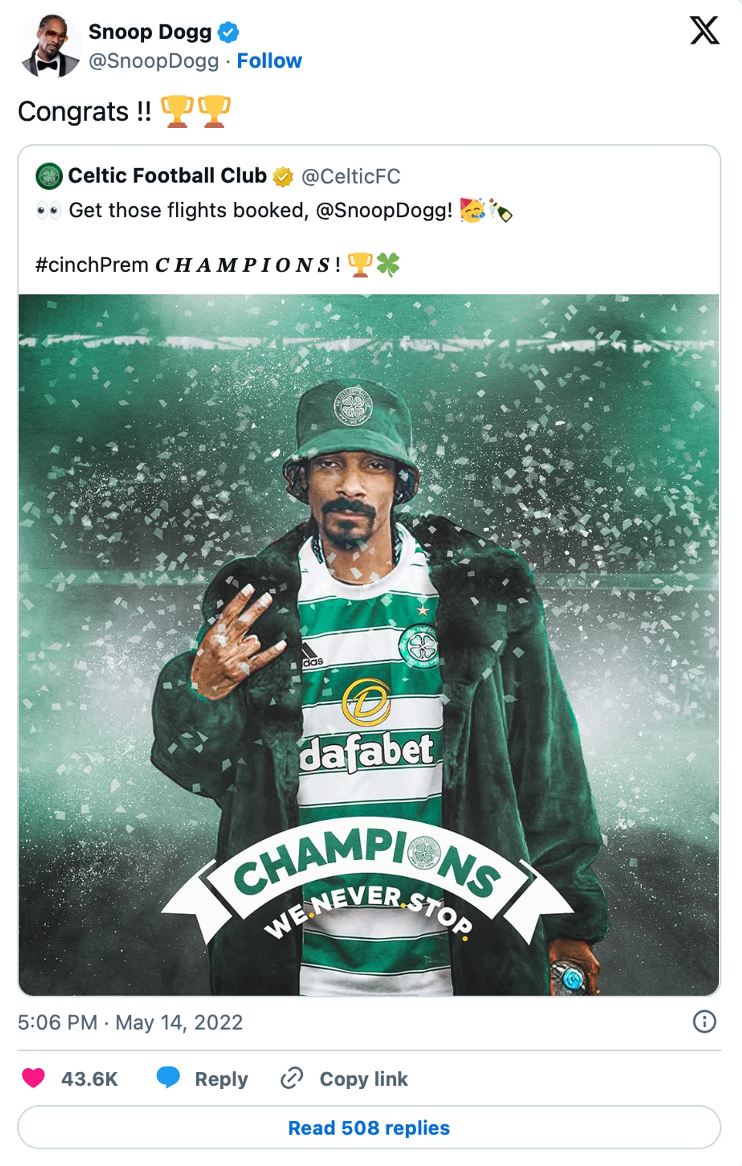 Зато клуб запомнил. После победы в лиге в соцсетях «Селтик» обратился к рэперу: «Бронируй билеты, Снуп Догг». Тот в ответ поздравил с титулом.
