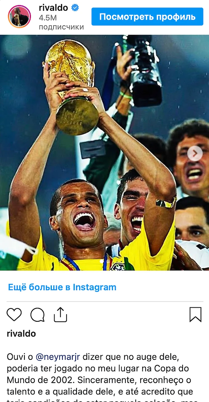 Ривалдо это задело. Настолько, что написал отдельный пост в соцсетях: «Неймар сказал, что на пике карьеры мог бы играть на моем месте на ЧМ-2002. Я признаю его талант – и даже верю, что он мог бы быть в той команде. Но при всем уважении и восхищении им, могу со 100-процентной уверенностью сказать, что он бы не смог меня заменить. В то время я был настолько сосредоточен, полон решимости и жаждал завоевать титул чемпиона мира, что никто, независимо от того, насколько хорош был на пике карьеры, не мог занять мое место.