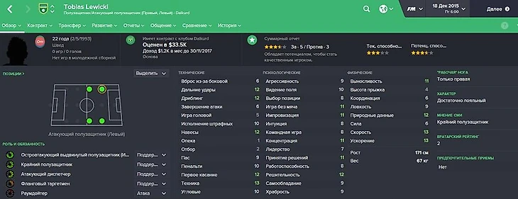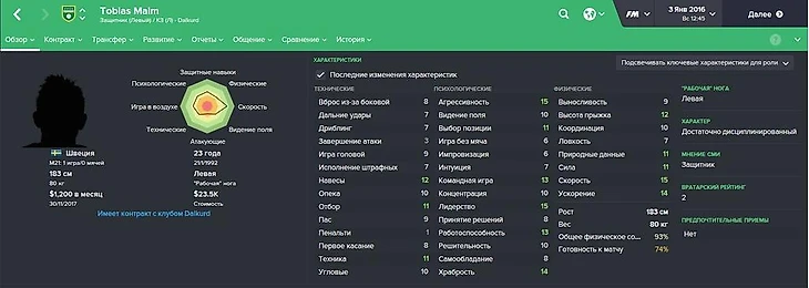 Очень много времени и попыток на приобретение качественного левого защитника было потрачено. Без преувеличений, искал во всех 2ых и 3их дивизионах европейских чемпионатов, никто не хотел ехать к нам играть. И тут я наткнулся на клуб, который вылетел в том году в 3ий дивизион и увидел данного персонажа. Скорость,отбор, агрессивность, техника, всё что нужно для атакующего фуллбэка у него есть. Эдакий "Марсело" для нашего клуба. Выложил за него рекордные для клуба 22к$, и за контракт не поскупился. железные игрок основы на этот сезон. Выпускник академии Мальме, после был замечен в клубах рангом ниже, есть 1 матч за молодежку Швеции.