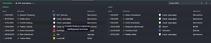 Фримпонг был в аренде в прошлом сезоне, у него заканчивался контракт, и я решил забрать его к себе. Хороший цепкий полузащитник, с пасом, такие нам нужны. отпустил универсального защитника Азизи, т.к. за него дали денег, которых он не стоит. Также, совершенно неожиданно пришло предложение на молодого центрального защитника - Хьелстранда. Вместе с желанием Мете (12 игр, 5 голов в том сезоне) это дало экономию в зарплате, которую ранее и пустили на усиление.