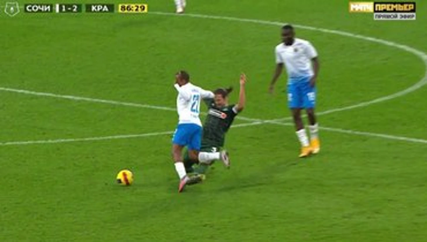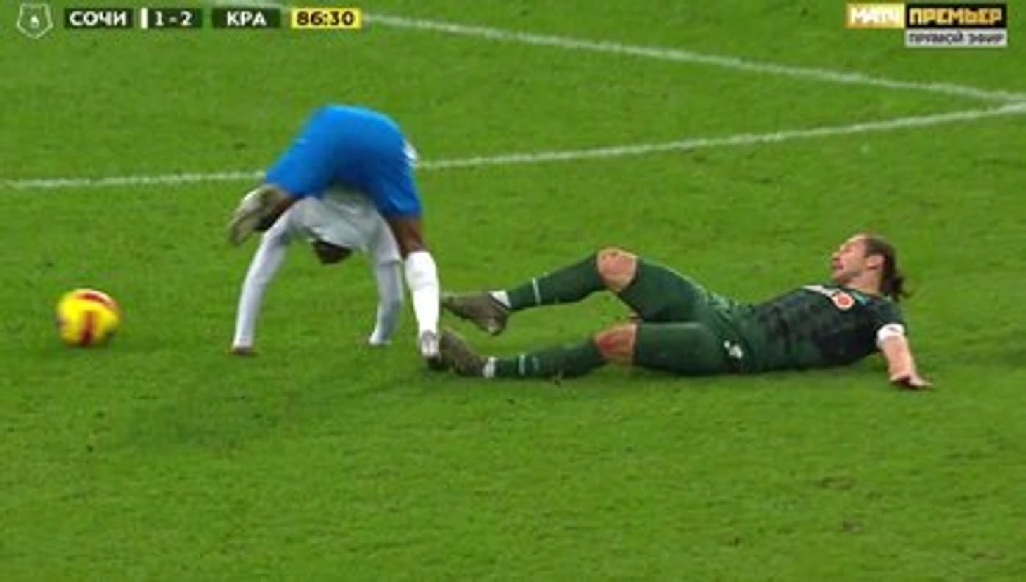 Ошибается Карасев. Это не красная карточка. В данном эпизоде нет агрессии со стороны Крыховяка и ногой он попадает в низ стопы. Почему не вмешался Шадыханов? Видимо парень подустал. 2-ой матч подряд работает.