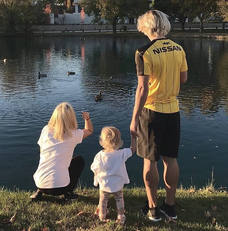 Молодая семья блондинчиков Гризманн, кормят уточек в парке Мадрида: