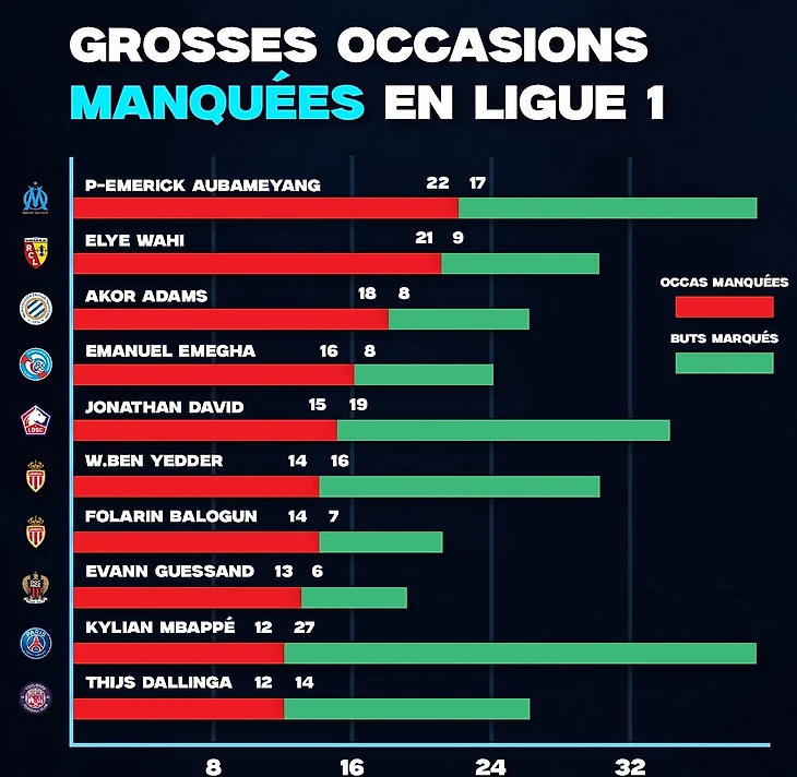Пьер-Эмерик Обамеянг является главным футболистом по упущенным голевым моментам в Лиге 1. Забив 17 мячей в главном чемпионате Франции, у габонца 22 явных упущенных момента. По этому показателю, он обошёл даже Элье Ваи из «Ланса», самого критикуемого нападающего в сезоне.