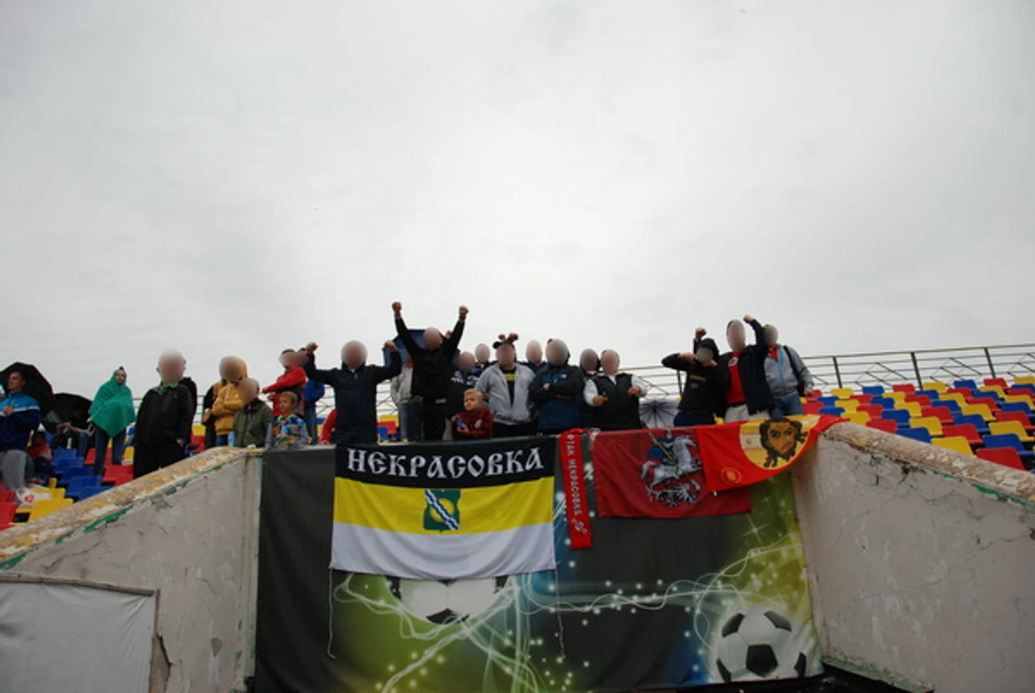 У Некрасовки была организованная поддержка. Человек, кажется, двадцать. Были баннеры, и были постоянные заряды за Некрасовку. Записывать не стал, просто заметил для себя, что в стиле боления сказывается спартаковское прошлое команды. Поднялся на трибуну, познакомился, спросил, надо ли замазывать лица. Сказали – да, надо замазать. Сказали, что регулярно ходят на домашние матчи (кстати, Некрасовка – район Москвы, но совсем рядом с Люберцами). Сказали, что они – не фанатская группировка, а просто друзья игроков, которые решили оказывать команде организованную поддержку. Один из фанатов Некрасовки сказал своим друзьям: человек пришел, угостите человека, чего вы стоите. Был налит пластиковый стаканчик водки, выдан бутерброд с сыром, стаканчик был выпит и бутерброд был съеден. Это очень приятные люди – фанаты футбольного клуба Некрасовка.