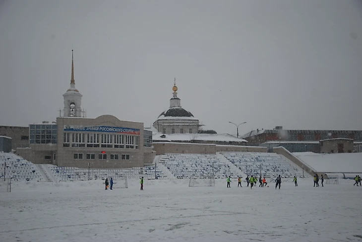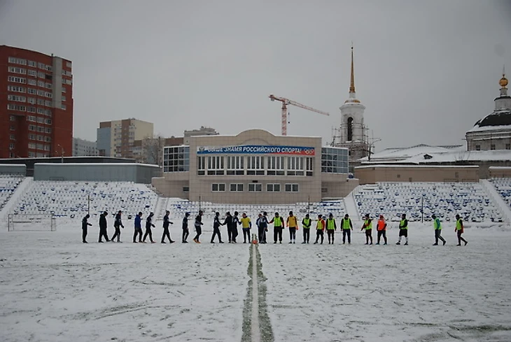 В целом все это вместе выглядело довольно сюрреалистично. Заснеженное поле, заваленные снегом трибуны, церковь, новый жилой комплекс несколько мрачноватого вида, сильный снегопад, все бело-серое, мельтешащие на поле футболисты, бело-серое небо, в общем, красота.