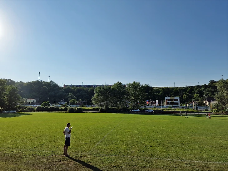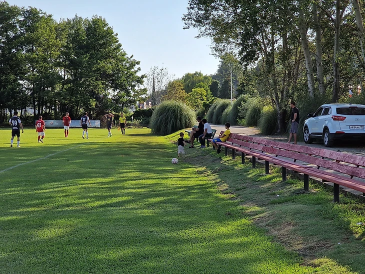 Трибуны (если это можно назвать трибунами) отличаются скудостью. Со стороны дороги вдоль поля тянется очень длинная деревянная скамейка. Напротив к полю примыкает металлическая конструкция с закреплёнными на ней деревянными лавками в пять рядов. Есть еще маленький столик с небольшой лавочкой. Собственно, это все. На длинной скамейке сидело несколько человек (два, три, четыре). На металлической конструкции сначала размещался один парень, потом ушел, и вместо него пришел и разместился другой парень. Позже и он ушел. За столиком сидело несколько дядек. Столик при этом пустовал, а мог бы и не пустовать, на нём могли бы разместиться, например, сосуды с увеселительными напитками (представителей правоохранительных и других контролирующих органов на матче не было).
