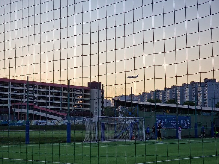 Не над самым стадионом, но немного в стороне то и дело пролетали самолеты, идущие на посадку во Внуково. Они проплывали в вечернем небе, и это было, простите за банальность, красиво. Очередной стадион с самолетами.