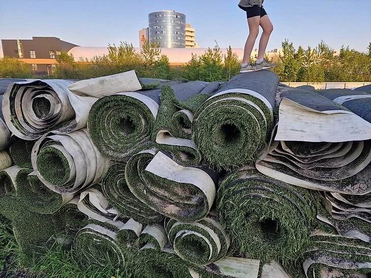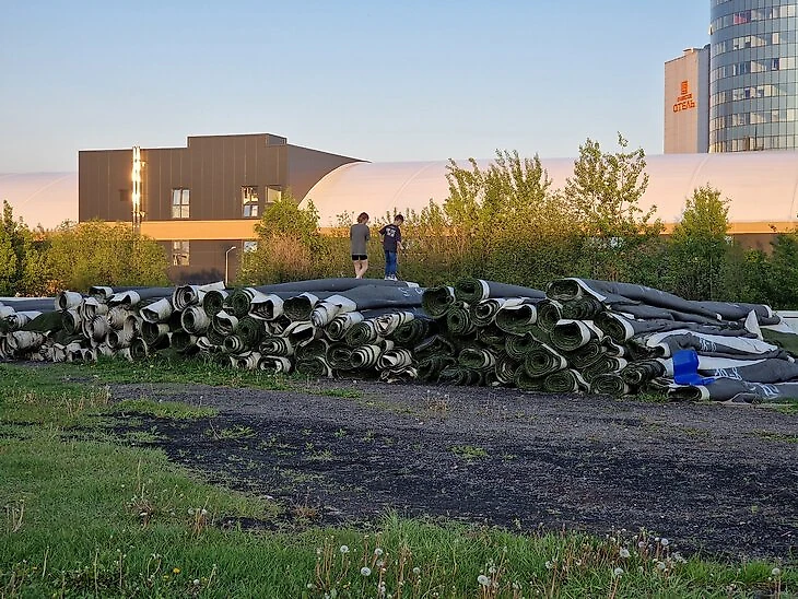 Рядом с вторым полем на земле лежали многочисленные рулоны с искусственным покрытием. Трудно было сказать, то ли это новое покрытие, которое должны положить вместо нынешнего (вполне приличного, не лысого), то ли это старое покрытие, вместо которого положили нынешнее, новое.