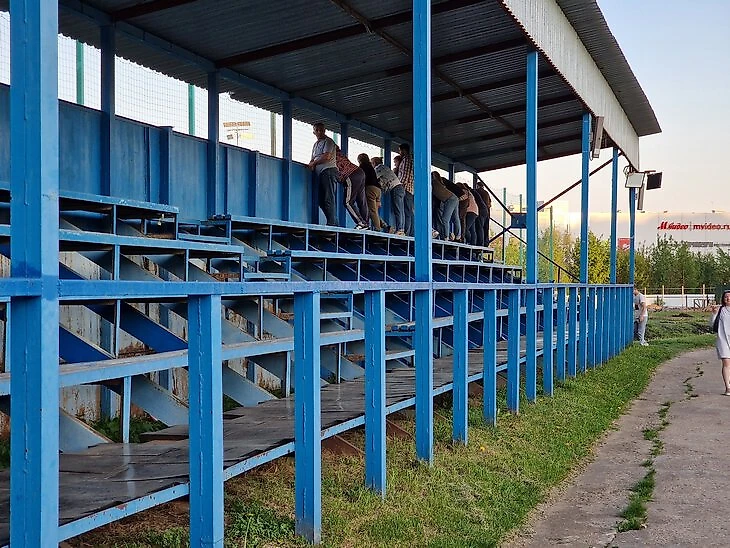 Что отрадно, между полем и трибунами нет пресловутых сеток, уродующих почти все небольшие стадионы Москвы. Сетки есть только за воротами, это нормально. Но на поле нет ни ворот, ни разметки, — похоже, сейчас на нем не играют. По крайней мере, в этом случае Росич-2 (дублеры) играл именно на втором поле. Там искусственный газон, трибуна тоже под крышей, но чуть поменьше и пониже. Наверное, именно поэтому, из-за лучшего обзора, часть болельщиков смотрела игру с трибуны основного поля, стоя на самом верху (второе поле примыкает к первому своим торцом).