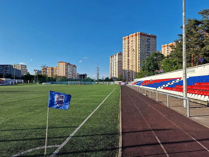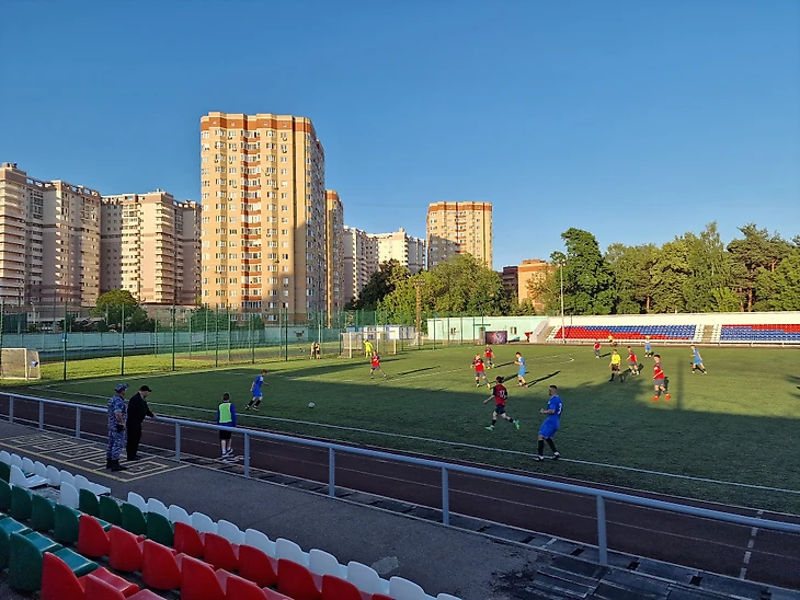 Успел к перерыву. Стадион, если так можно выразиться, радует глаз. Он очень удачно расположен. С одной стороны, как уже было сказано, железная дорога, по которой то и дело снуют электрички третьей линии Московских Центральных Диаметров (МЦД3). За железной дорогой — огромный новый желто-серо-белый жилой дом. Если бы это был не дом, а человек, то о нем можно было бы сказать «приятной наружности», впрочем, почему бы не сказать так и о доме. В общем, нормальный такой дом. За одной из трибун — сосновый микролес, или как ещё можно назвать совсем небольшой участок земли, на котором растут сосны.
