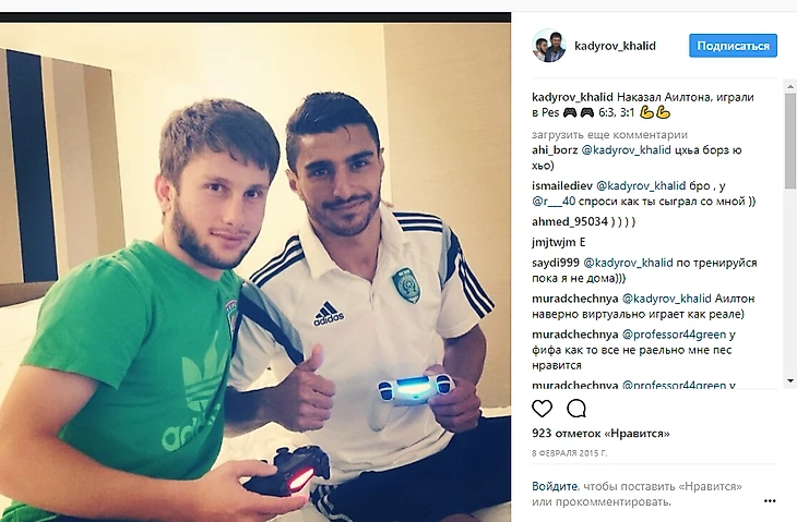 В свободное от футбола время “чеченский Месси” (прим. ред.-с Лео его сравнивали в программе “Студия 94”) увлекается футбольными симуляторами. Фото из Instagram где он наказывает (прям. цитата) Аилтона