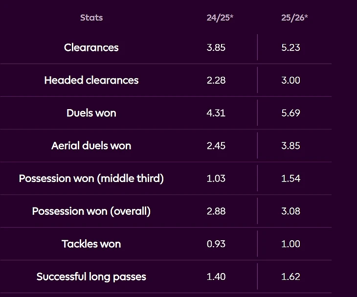 Де Лигт значительно превосходит своих товарищей по команде по большинству показателей, когда речь идёт о защитных действиях и выигрыше важнейших единоборств.
