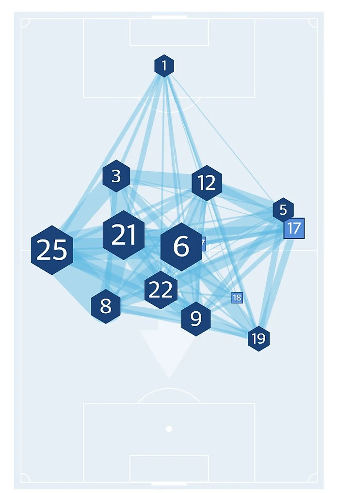 -- Да, Ка'рк, в этом есть ризон. Давеча вот в матче с Лестером Мхитарян, технически исполняющий в тот вечер "Снейдера", ввиду мании Ибры опускаться глубоко вниз, слишком уж часто оказывался с ним на одной линии. Гляди-ка на усреднённые позиции игроков Юнайтед в том матче: