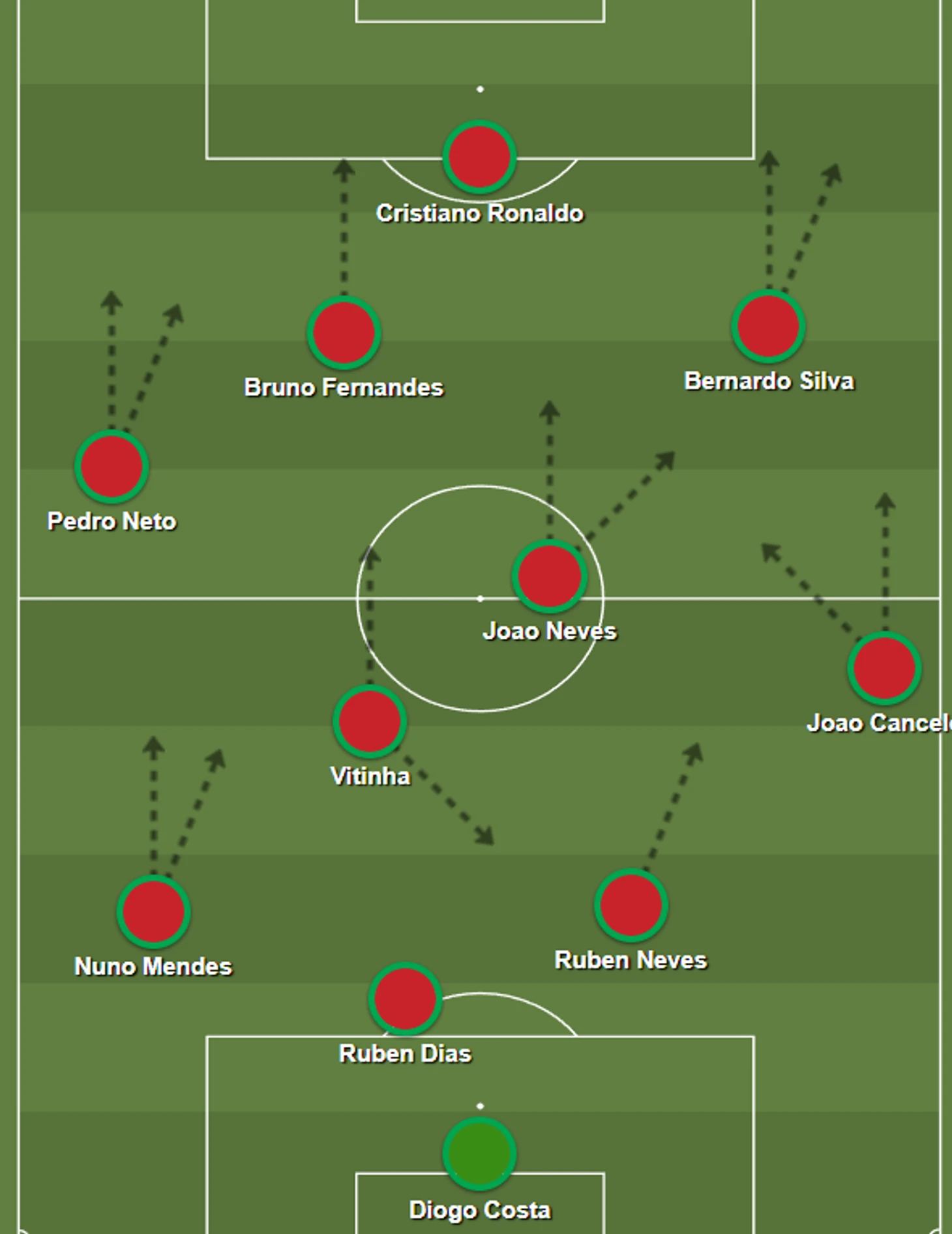 — Карк! — сквозь чих внезапно заорал Кази’мир, — Ты заметил иронию? Пока португалец Рубен Аморим упорно ставит схему из трёх ЦЗ, тренер сборной его же нации по футболу, испанец Роберто Мартинес, выпускает на матч против венгров лишь одного номинального ЦЗ, Рубена Диаша. Ведь условный второй ЦЗ, опорник Рубен Невеш, больше напоминал крайнего правого ЦЗ, с правом уходить выше в атаку, а третий, челнок Нуну Мендеш исполнял крайнего левого ЦЗ с жестким креном в атаку. Латералями же были вингер Педру Нету слева и Канселу справа. Всё это выглядело примерно так: