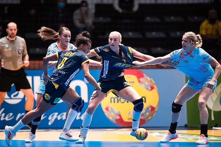 Скандинавки начали встречу безупречно. Они эффективно атаковали и цепко оборонялись. На последнем рубеже блестяще действовала Джессика Рюде. По итогам первого половины в ее активе было 8 сэйвов. Во многом благодаря надежности голкипера северянки уверенно вели по ходу тайма. Их максимальный перевес составлял 5 мячей. Но ближе к перерыву скандинавки потеряли концентрацию, позволили соперницам отличиться четырежды кряду и сократить отставание до минимума.