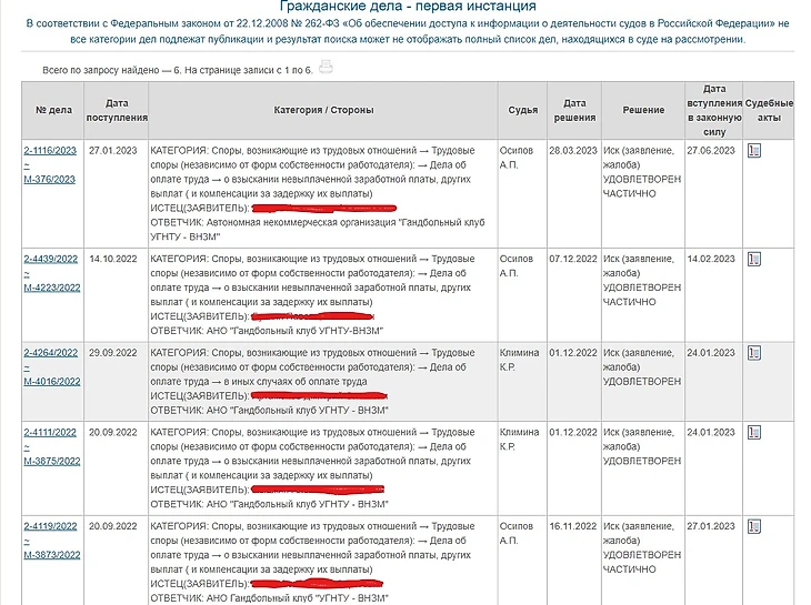 2. В 2022-2023 только в одном районном суде было 5 дел игроков против «Акбузата», все в пользу гандболистов: