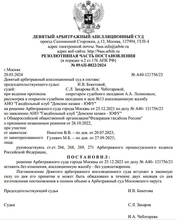 5 апреля 2024 Девятый Арбитражный апелляционный суд подтвердил законность Решения Арбитражного суда г. Москвы, в котором отказали "Донским Казакам-ЮФУ" (Таганрог) в признании незаконным решения Федерации гандбола России (ФГР) об исключении команды из всех гандбольных соревнований (дело А40-121756/2023).