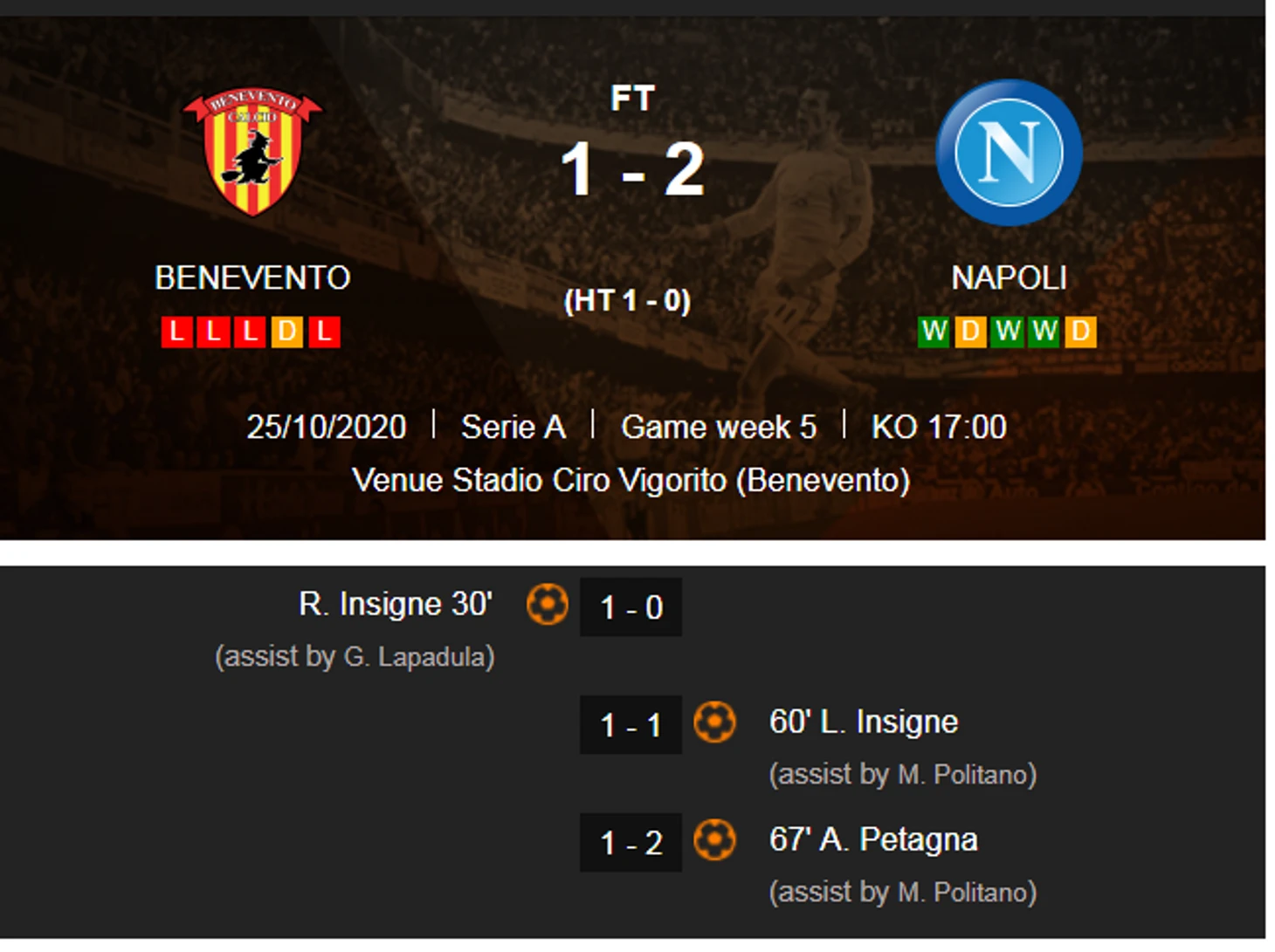 25 октября 2020 года Роберто Инсинье забил гол в матче Беневенто со своим бывшим клубом Наполи; брат Роберто Лоренцо также был в протоколе, когда Наполи выиграл 2–1. Это был 1й гол Роберто Инсинье в высшем дивизионе итальянского футбола. Кроме того, это был только второй раз в истории Серии А, когда два брата забили друг другу гол в матче!!!!!!!!!!!!!!!!!!!!!!!!!!