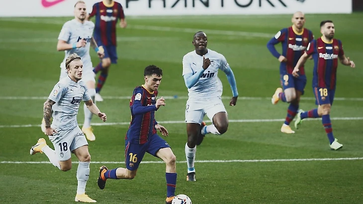 Линия полузащиты. Бускетс – Педри – Коутиньо. Позиционно подопечные Грасии особо не играли, поэтому оценить полузащиту в плане обороны сложно. Педри выделялся. Продвижение тоже давалось трудно, противник закрывался слишком низко – так что средняя линия и защита чуть ли не играли на позициях нападающих. То есть, «Валенсия» вся закрывалась в обороне, «Барселона» всеми футболистами пыталась эту оборону взломать. Получалось сомнительно.