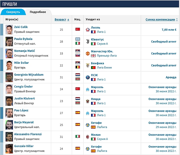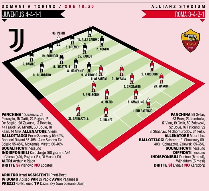 Проведенное летнее трансферное окно римлянами по именам выглядит столь же потрясающе, как и у самого Ювентуса. И что крайне важно - почти все приобретения совершались на условиях прихода бесплатными агентами и ввиду продаж Рома умудрилась на данный момент даже в плюс в расчете баланса продаж и покупок. Однако травмы Дзаньоло и Вейналдума вносит небольшой хаос в центр поля при построении, но вряд ли это хотя немного смутит Жозе - Особенный, равно как и Аллегри, умеет строить команду из того, что есть в наличии. Главный же новичок Паоло Дибала и прошлогодняя звезда Тэмми Абрахам прекрасно себя чувствуют и готовы возглавить туринский поход.