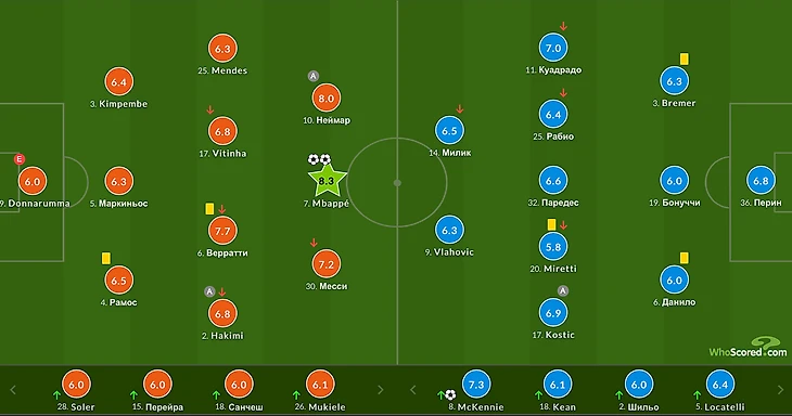 Вопреки выставленным по итогу матча оценкам и признании Маккенни главным героем Юве, на мой взгляд лучшим игроком со стороны Ювентуса стал Паредес. У него очень успешно получилось взять на себя роль плеймейкера, которого у Ювентуса не было больше года. Помимо этого Паредес вынудил Верратти больше двигаться и терять периодически центр поля. Это мало отразилось на атакующей мощи ПСЖ, однако помогало Ювентусу быстрее продвигать мяч вперед при своих атаках и в разы увеличить креатив при классических для нынешнего Турина контратаках. Аргентинец старался действовать неординарно, подольше держать у себя мяч, идти чаще в обыгрыш, а его пас вразрез на последних минутах игры через обе оборонительные линии ПСЖ на Влаховича заслуживает отдельных аплодисментов. Заодно выделим Перина - это лучший сезон в карьере итальянского вратаря, который на зубах выцарапал для своей команды минимальный разрыв в счете.