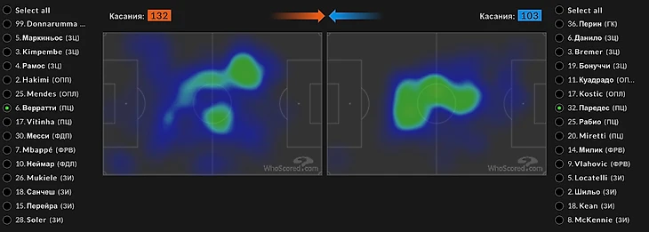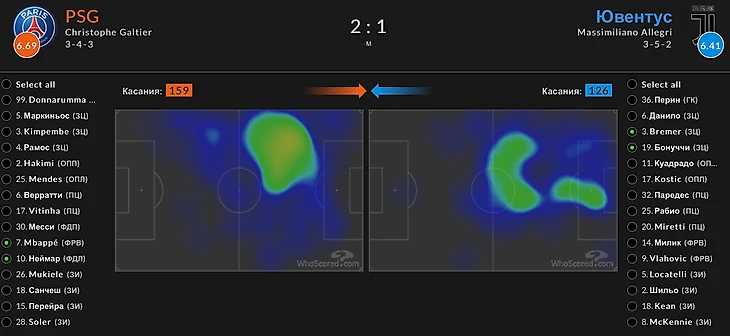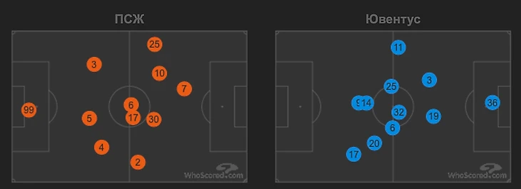 Итальянские СМИ уже поспешили обвинить Ювентус в пассивности при выходе из обороны и в низком опорном блоке, однако итоговые позиции игроков опровергают это на корню: большую часть времени Ювентус действовал высоко, упуская лишь Мбаппе за спину Бремера и Бонуччи. Здесь ключевая роль была у Неймара, который просто не замечал соперников впереди и постоянно успешно находил зазоры в защите. Как итог - Ювентус впервые в этом сезоне действительно отошел высоко от ворот, но впервые проиграл.
