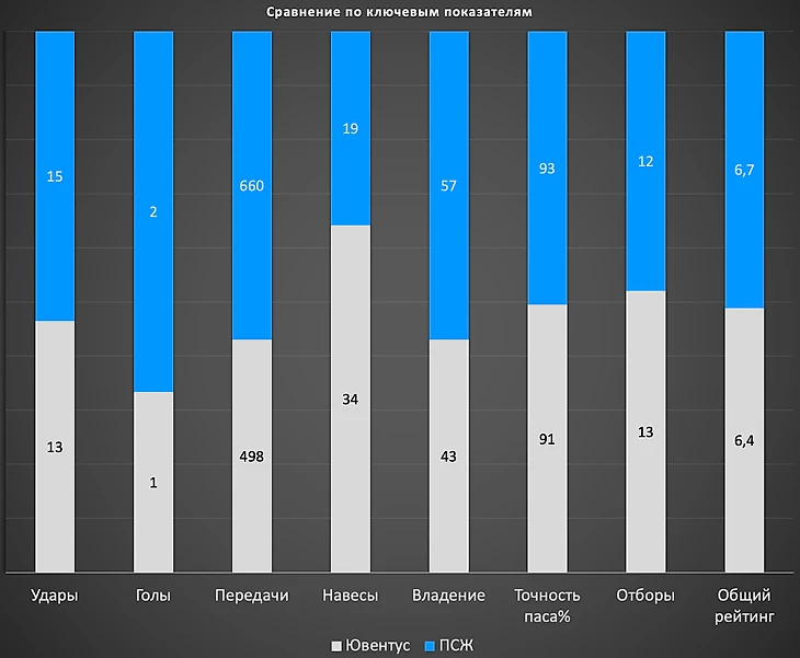 ПСЖ превзошел Ювентус во всех компонентах: статистических, индивидуальных и голевых.