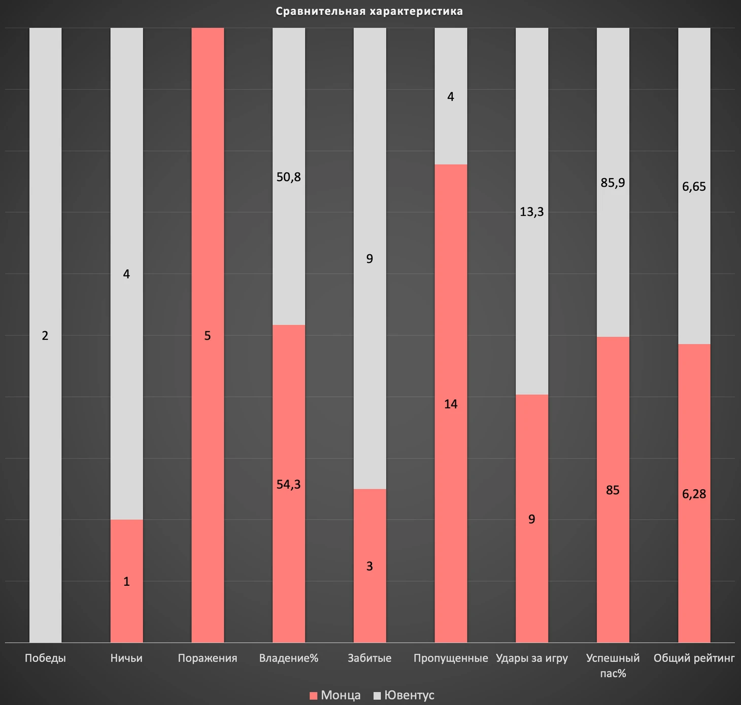 Здесь у Монцы, разумеется, нет никаких шансов, команда слишком уступает Ювентусу как в классе, так и в результатах. Единственное преимущество в статистических показателях отмечается в зоне владения мячом, но это мало о чем говорит: Ювентус чаще всего отдает мяч сопернику и играет вторым номером.