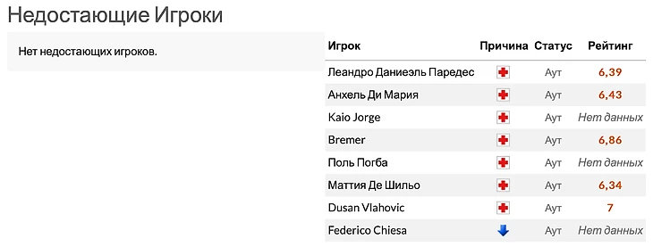 Душан Влахович, при всех приписываемых ему проблемах, идет в очень солидном голевом темпе и борется за звание лучшего бомбардира Серии А с шестью голами, однако из-за мышечной усталости медицинский штаб рекомендовал дать сербу передышку перед последней игрой в Лиге Чемпионов. Также отсутствует лучший защитник и фактически лучший футболист этого сезона в Ювентусе Глейсон Бремер, а также новички Ди Мария с Леандро Паредесом. Поль Погба пока появляется только в Тик Токе и Call of Duty вместо футбольного поля, а Федерико Кьеза только набирает физические кондиции, чтобы после столь длительного отсутствия моментально не вернутся обратно в лазарет.