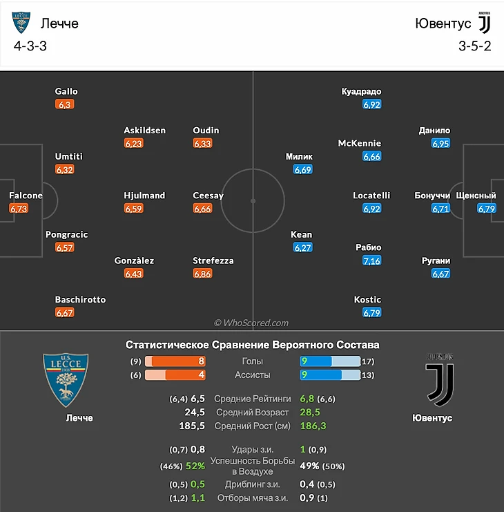 Как и подобает играм клубов из разных полюсов таблицы, они сильно разнятся по статистическим показателям. Лечче в 11 играх сумели победить лишь один раз, пять раз поделили очки и пять раз ушли с поля ни с чем. Ювентус здесь выглядит, разумеется, солиднее: пять побед, четыре ничьи и пока всего два поражения (пусть даже одно из них от Монцы). При этом обязательно нужно говорить вслух очевидное - из прямых конкурентов за верхнюю четверку Юве пересекался пока только с Миланом и Ромой, не победив тех ни разу.