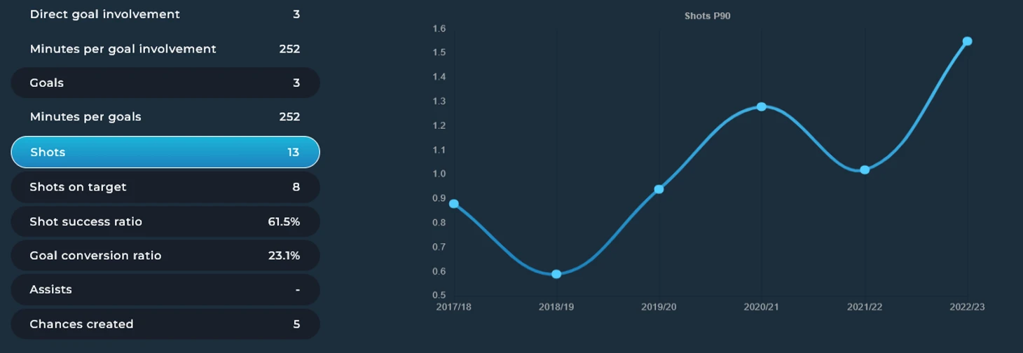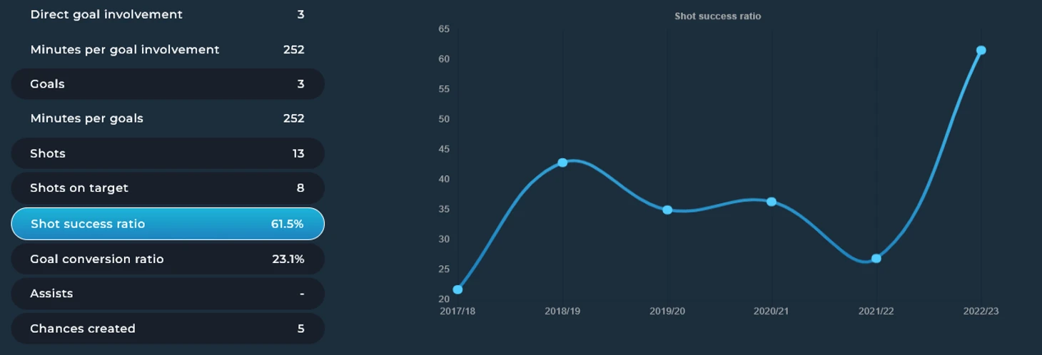 Рабьо за сыгранные девять матчей уже сделал больше, чем за прошлый сезон в целом. Средние показатели в расчете на 90 минут выросли многократно: это касается как забитых мячей на матч, так и точности ударов.