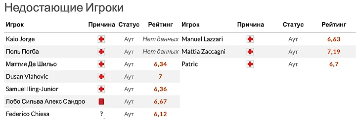 У Ювентуса и Лацио будут отсутствовать главные бомбардиры Влахович и Иммобиле (не успевших восстановиться), забившие по шесть мячей в Серии А. В остальном по всем позициям можно назвать составы основными.