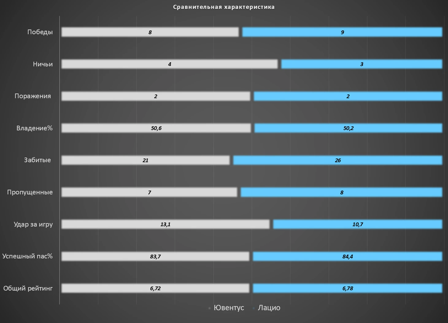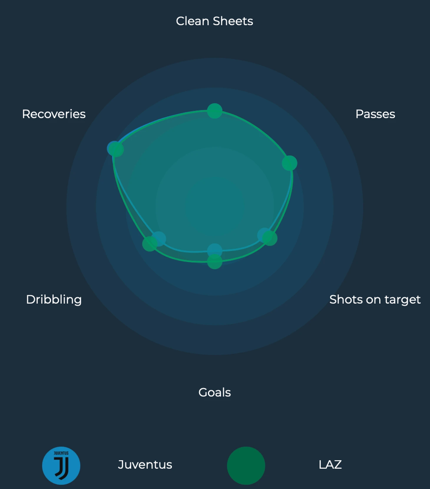 Команды одинаково владеют мячом, меньше всех пропускают в Италии, почти не проигрывают, одинаково успешны в проценте точности отданных передач, ударам по воротам и сухим матчам.