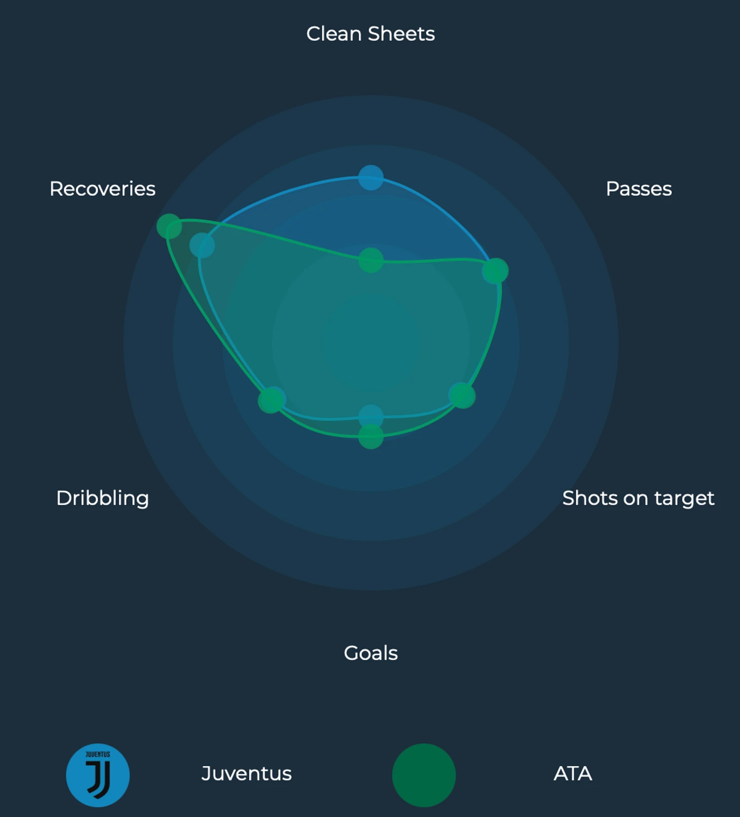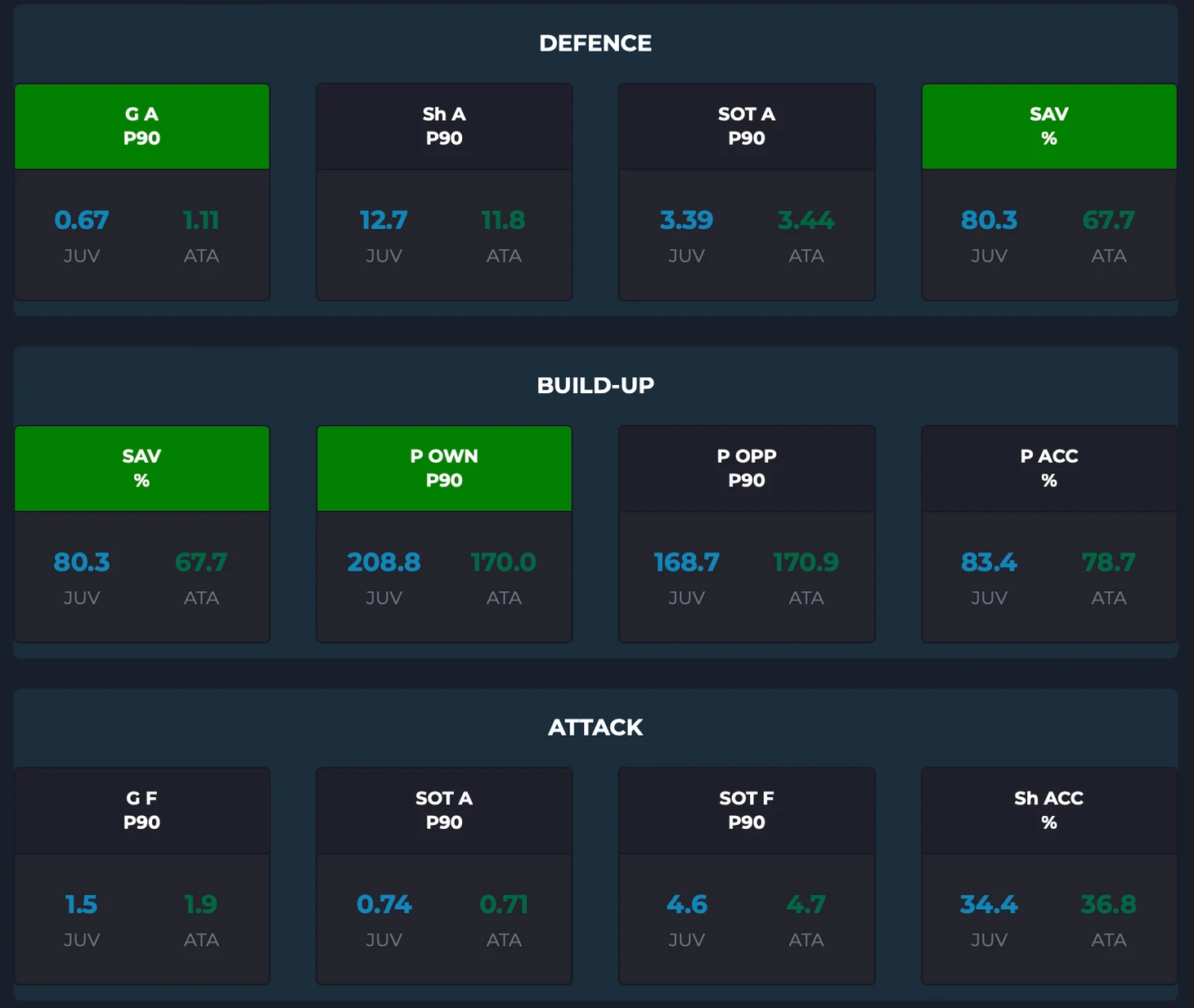 Для Аталанты характерна игра вторым номером, что отражается в низком процентном соотношении в территориальном плане и владении мячом. У Юве ситуация не намного лучше, но все же лучше. Гасперини в этом сезоне удивил болельщиков Аталанты тем, что у его команды сильно просела точность передач. Немало критики достается и вратарю бергамасков Муссо, который показывает очень низкий процент спасений в 67,7%. У его визави Щенсны - 89,3%, что напрямую отразилось в количестве сухих матчей в этом сезоне.
