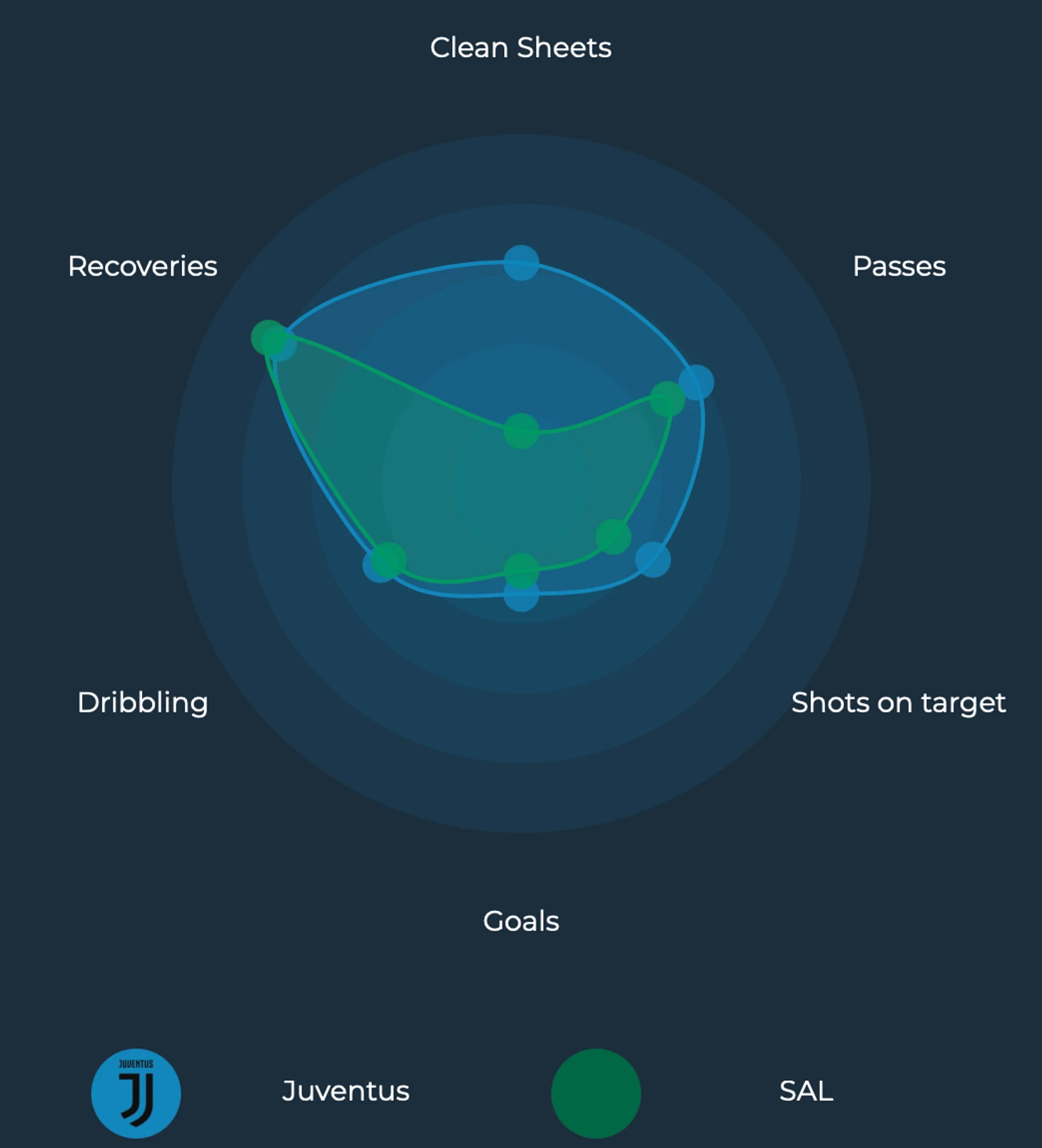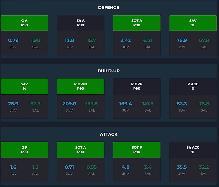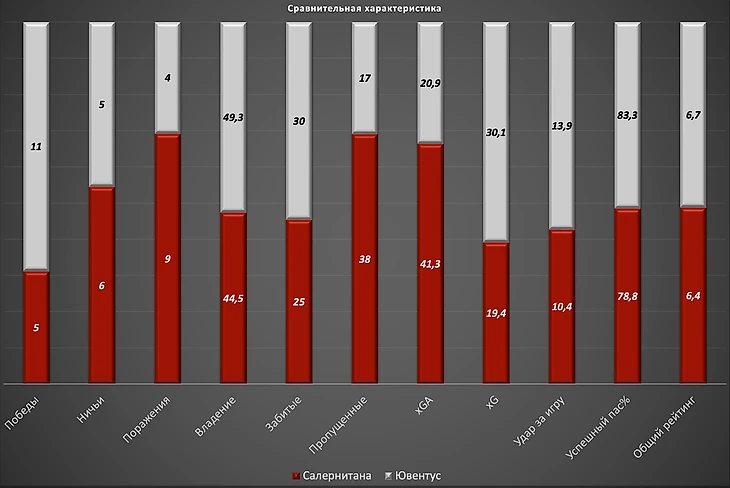 Салернитана лишь трижды сумела сохранить свои ворота в неприкосновенности в этом сезоне, пропуская в среднем 1,9 гола в расчете на 90 минут против 0,8 у Ювентуса. Это связано с низкой линией обороны, которая допускает подобное обилие ударов в сторону ворот - за матч Салернитана умудряется в среднем позволить ударить в среднем 15,7 раз против 12,8 у Ювентуса. И казалось бы, разница не столь большая, однако следует параллельно оценить и полет мяча в створ, что демонстрирует качество работы защитников. И если оборона Ювентуса вынуждает соперника просто лупить издалека и куда попало (всего 3,4 в створ за 90 минут), то Салернитана вынуждена фиксировать прискорбные 6,2 в удара в среднем в створ при учете повышенной опасности момента - каждый третий удар в створ для клуба из Салерно становится голом.