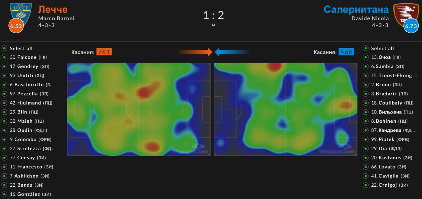 У Салернитаны все еще проще: ранее уволенный и сразу же восстановленный на тренерском мостике Давиде Николо проповедует 4-3-3 с высоким подключением фланговых защитников. Это оправдывает себя в атаке, где Самбия и Брадарич успешно доходят до чужой штрафной и обеспечивают Диа мячом путем навесов и прострелов. Однако такой подход пагубно сказывается на пропущенных атаках - если взглянуть на последний матч команды в качестве примера (против Лечче), тепловая карта демонстрирует нам низкую производительность возле собственной штрафной, откуда затем и следуют атаки соперника.