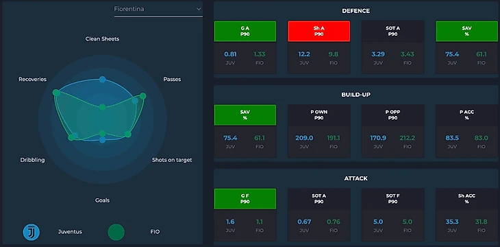 Фиорентина наравне с Ювентусом позволяет бить в створ собственных ворот чуть более трех раз за игру в среднем за сезон. При этом каждый третий удар становится в итоге голевым. У Ювентуса все куда радужнее - команда по-прежнему удерживает звание одной из самых надежных оборонительных линий чемпионата, являясь второй наименее пропускающей командой Серии А после Наполи (15 против 17). Примечательно, что 10 голов Ювентус пропустил лишь в последние 4 тура. Однако два последних матча (Лацио в Кубке и Салернитана в Серии А) Юве отыграл на ноль.