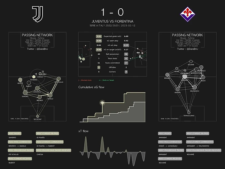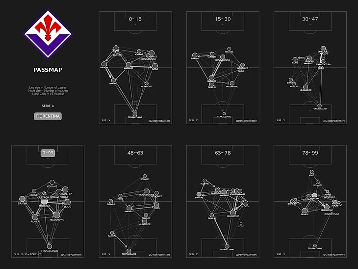 Чем примечателен был матч в исполнении хозяев поля? Ювентус, вопреки лично моим прогнозам, решил не ждать у моря погоды и самостоятельно включил тотальный контрпрессинг при сохранении низкого оборонительного блока прямо на старте. В чем отражалось подобное решение: больше всех передач отдал за 90 минут Алекс Сандро, при том, что наиболее частая разыгрываемая пара игроков при коротких передачах - Данило и Бремер. Вся оборонительная тройка Аллегри была больше всех вовлечена в игру, при том, что Фиорентина почти не била по воротам на старте игры и больше владела мячом. Защитники Юве отбирали все, что появлялось на подступах к штрафной и все, что затем летело в створ, тем более, что в основном летело только в результате дальних ударов.