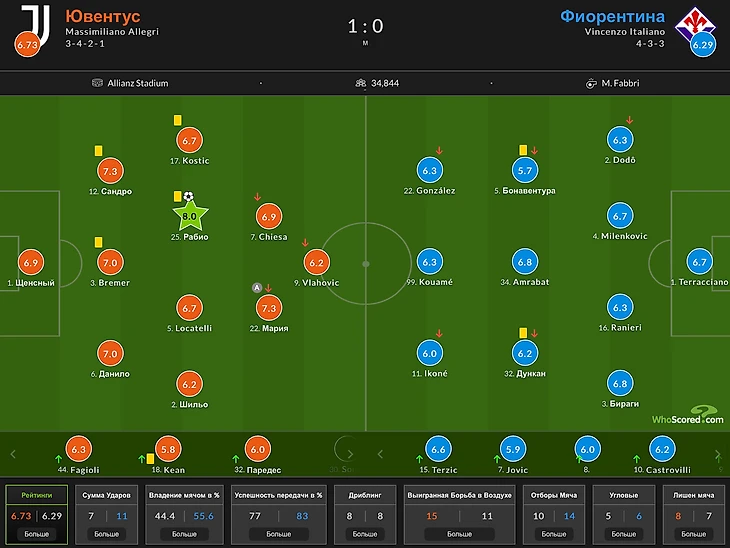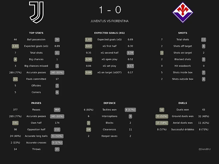 Тем не менее, даже непривычно активный Ювентус не часто доходил до ворот соперника и всего дважды пробил в створ ворот против шесть ударов в створ ворот Щенсны. И это вызывает удивление, поскольку xG у Ювентуса почти вдвое превышает тот же показатель у Фиорентины - моменты Юве были потенциально опаснее и ошибки защитников фиалок при должной реализации могли привести и к разгрому.